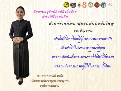 ขอเชิญชวนข้าราชการ พนักงาน เจ้าหน้าที่ ภาคีเครือข่าย และประชาชน สวมใส่ “ชุดไทยพระราชนิยม” มรดกแห่งสมเด็จพระพันปีหลวง “สืบสาน อนุรักษ์ศิลป์ผ้าถิ่นไทย ดำรงไว้ในแผ่นดิน” ส่งเสริมและสืบสานความเป็นไทยด้วยการใช้และสวมใส่ผ้าไทยให้สนุกในทุกโอกาส อันเป็นค่านิยมด้านการรักษาวัฒนธรรมประเพณีไทยอันดีงาม กระตุ้นเศรษฐกิจฐานรากให้รายได้กระจายสู่ชุมชน ชุมชนพึ่งตนเองได้อย่างยั่งยืน